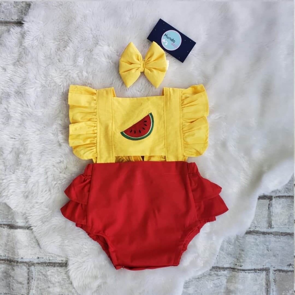 Romper Jardineira Body Festa Melância com Laço Mesversário Tricoline 100%Algodão