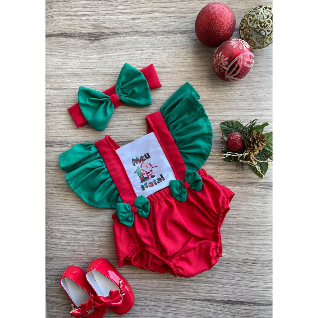 Romper temático natal mamãe noel jardineira para mesversário body meu primeiro natal