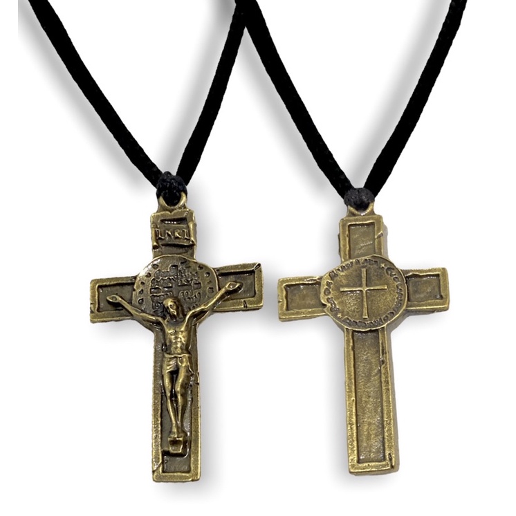 Colar Cordão com Cruz Crucifixo (3,7cm) e Medalha de São Bento - Metal em Prata Velha - 36,5cm