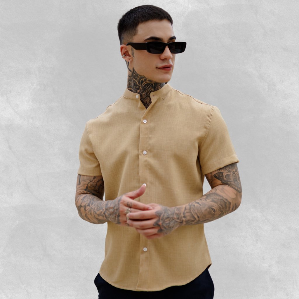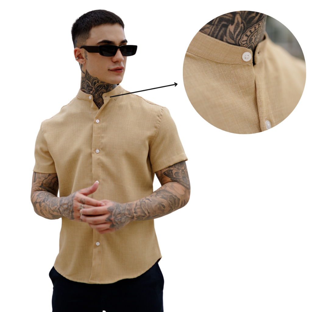 Camisa Social Masculina Gola Padre de Luxo Com Manga Curta Slim Fit Linho e Viscose Tecido Premium
