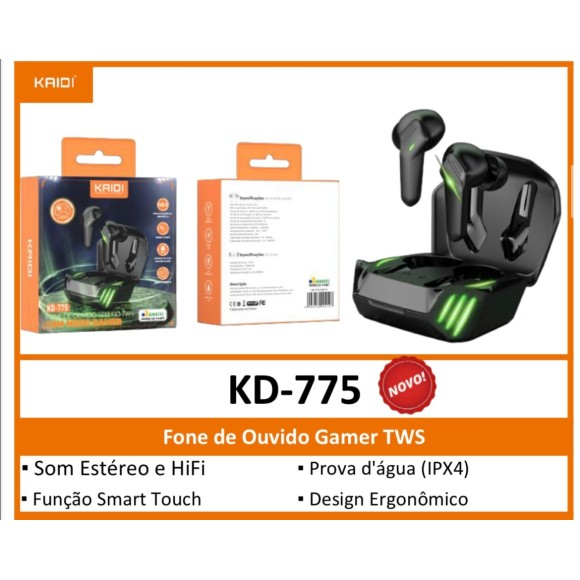 Fone De Ouvido Gamer Sem Fio Bluetooth 5.1 Tws Microfone Original Kaidi KD-775 Preto Smart Touch