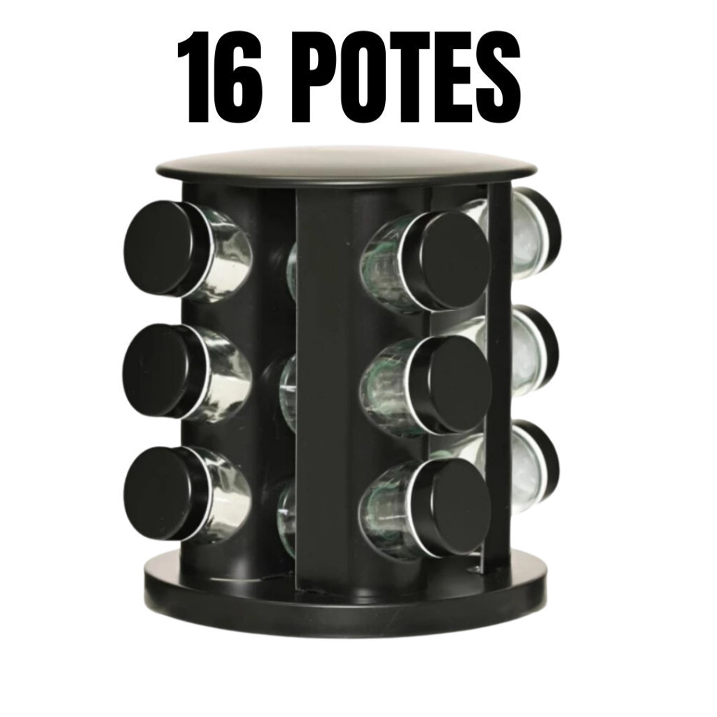 Porta Tempero Preto Giratorio Com 16 Potes Vidro
