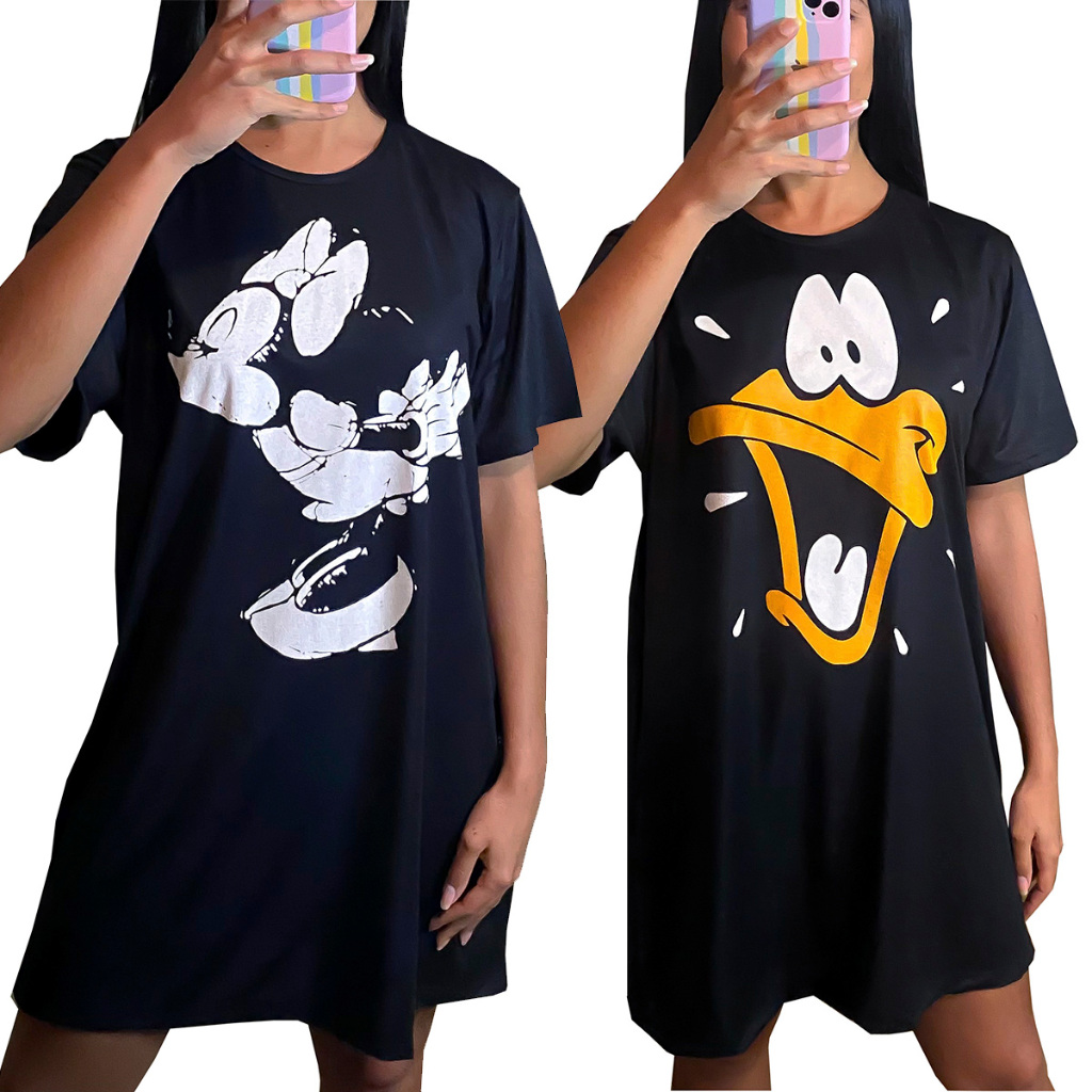 Camisola Camisão de Personagem Feminino Desenhos Divertidos Manga Curta Adulto