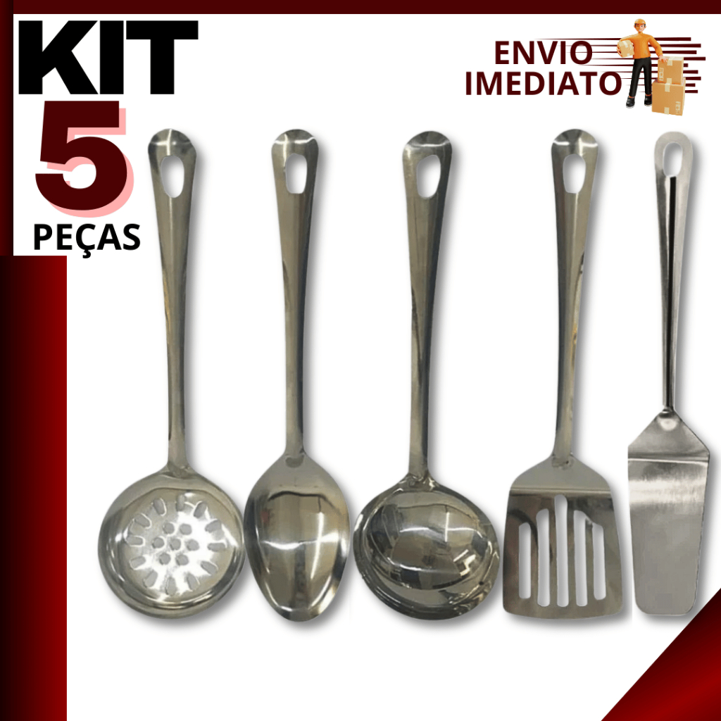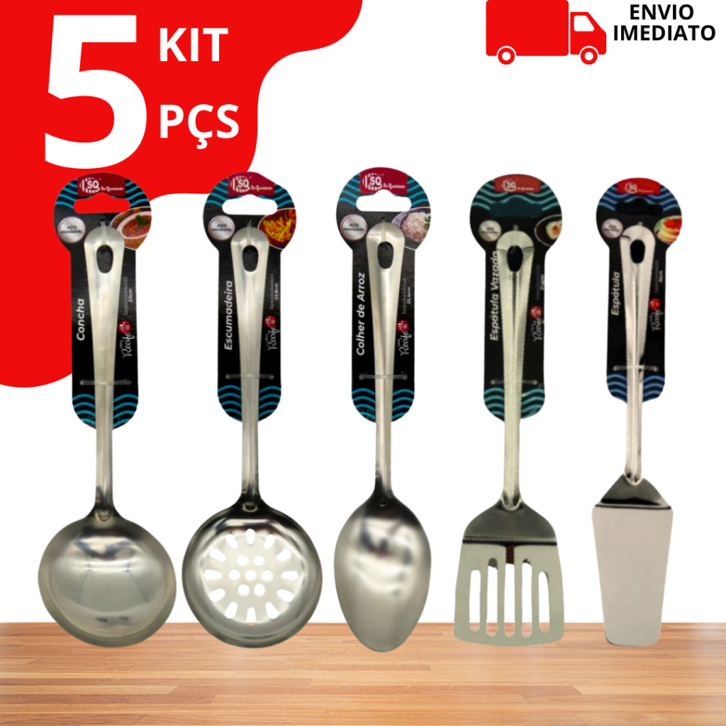 Kit 5 Utensílios em Aço Inox Para Servir 24cm | Colher, Concha, Escumadeira, Espátula e Bolo