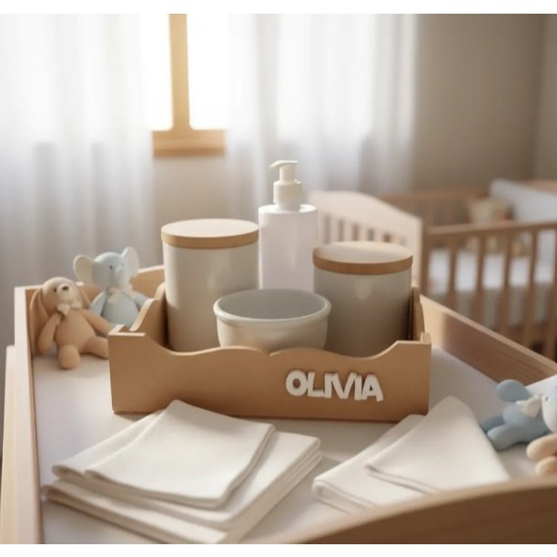Kit Higiene Bebê Porcelana nome personalizado bandeja alça sem pintura Tampa Madeira potes