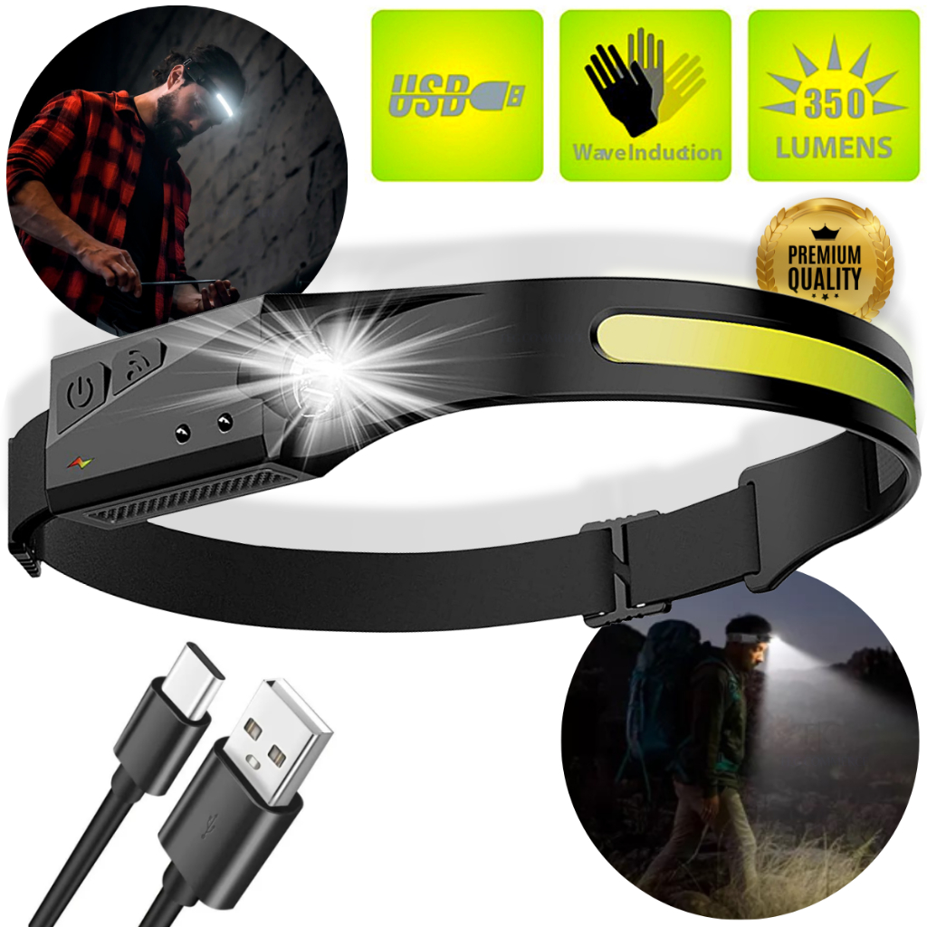 Lanterna De Cabeça Recarregável Led Usb Potente Com Sensor Cob Fita Ajustável Profissional Pesca Camping