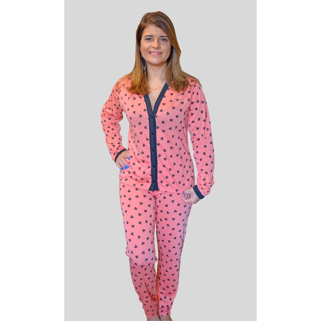 Pijama Baby Doll Amamentação Americano Estampado Manga Longa de Malha com Botões Frete Gratis
