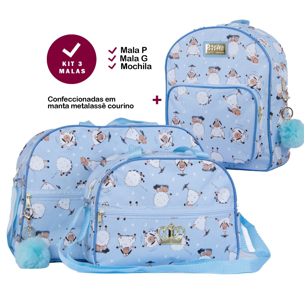 Kit C/ 3 Peças Mala Maternidade Mochila De Costas Infantil Menina e Menino Saida Hospital Reforçada Estampa Ovelhinha