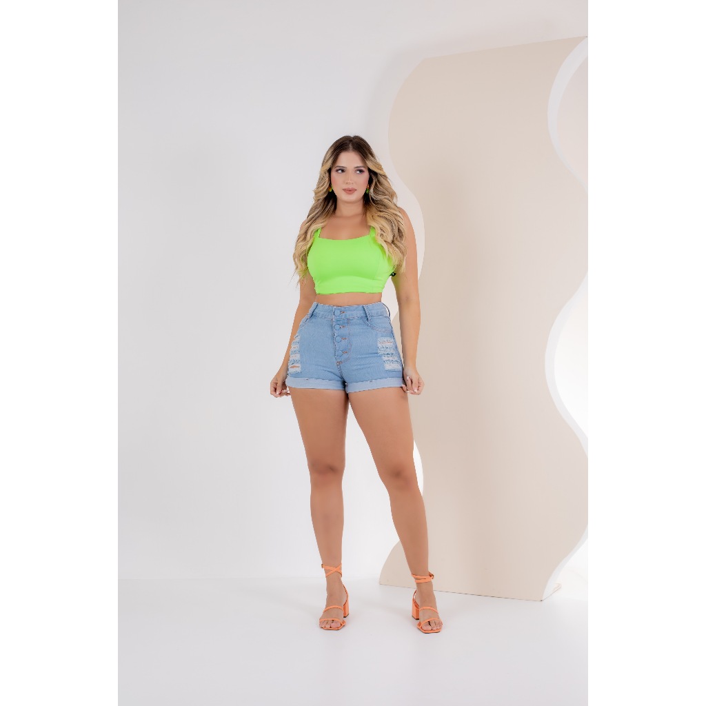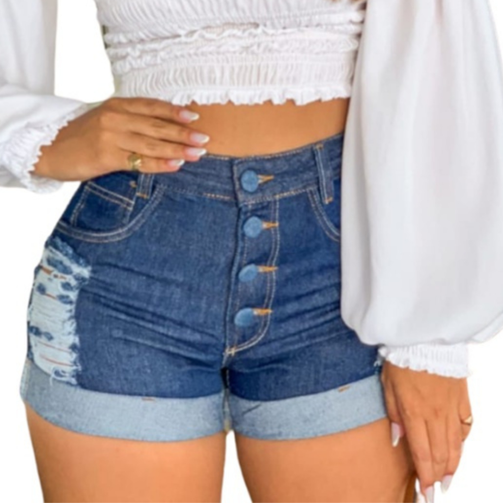 Bermuda Short Feminino Cintura Alta Cós Alta Jeans Short Curto Barra Dobrada Empina Bumbum Jeans Rasgado Feminino