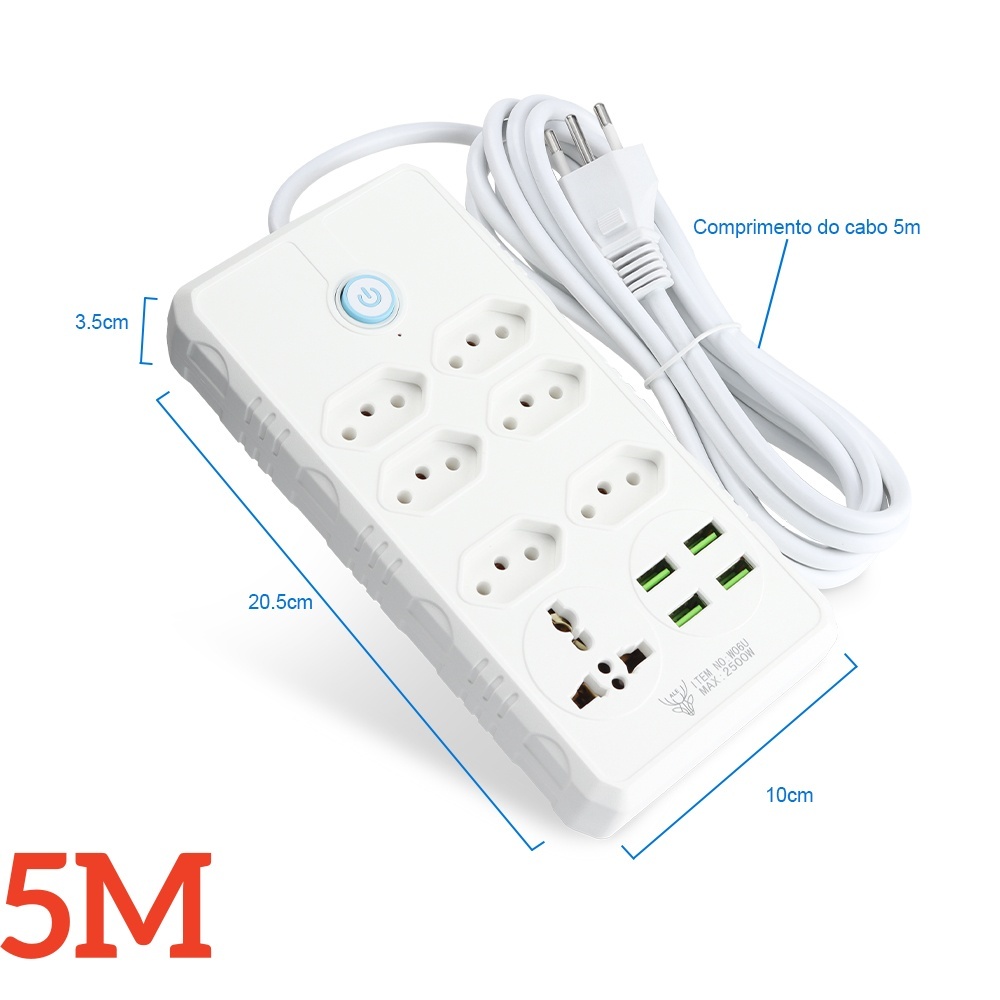 COIBEU Extensão Elétrica 2m/5m 10A Com 6 tomadas de energia 1 tomadas universal 4 USB Bivolt Power 110v/220v