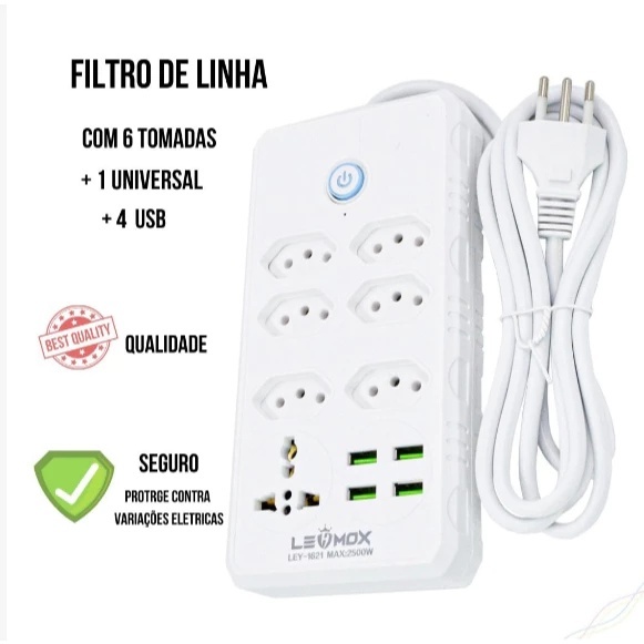 Régua Filtro de Linha com 6 Tomadas Extensão Elétrica 1 Universal 4 USB Bivolt 10A 110v/220v
