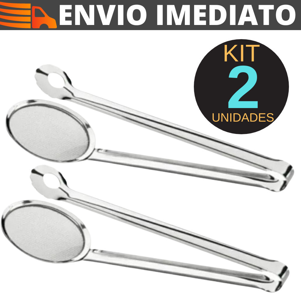 Kit 2 Pegador para Frituras Escumadeira Inox com Pinça e Peneira Batata Frango, Salgados