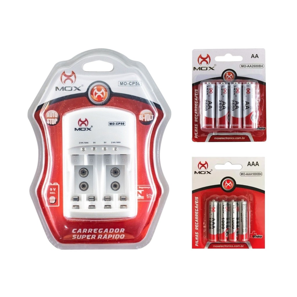 Super Kit Carregador De Pilha + Pilhas AA x AAA e Bateria 9V Mox Com 4 Pilhas Aa 2600mah Recarregável - ENVIO IMEDIATO