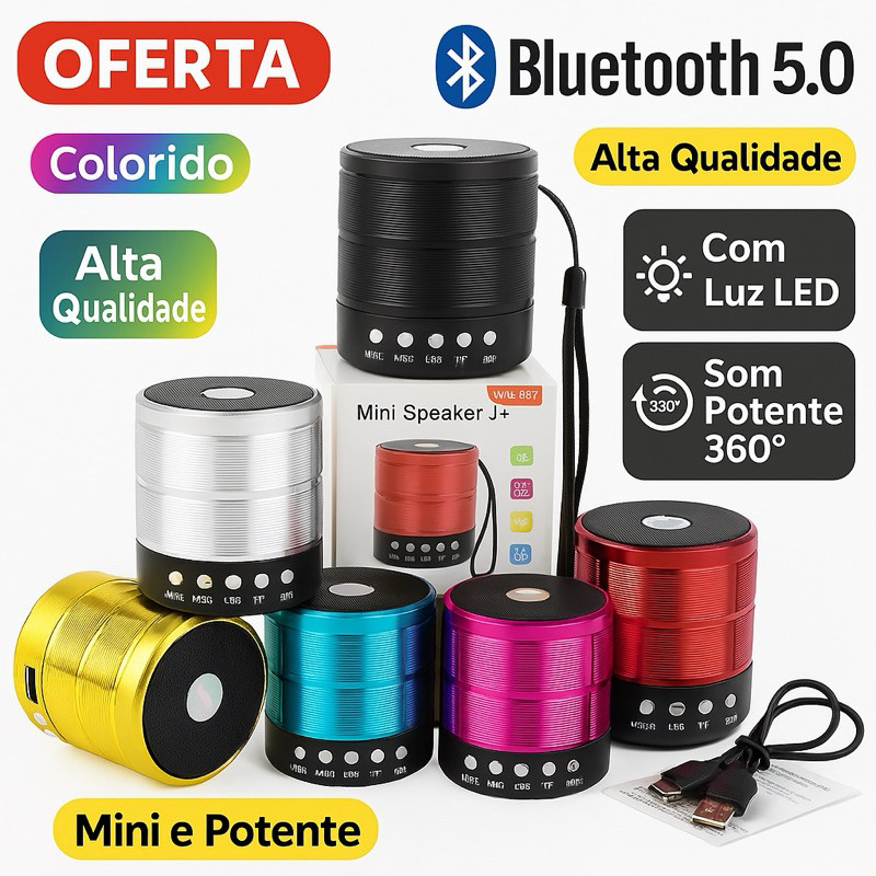 Kit 5 Mini Caixa de Som Bluetooth WS-887, Portátil, USB, Rádio FM, MP3, P2, SD Card
