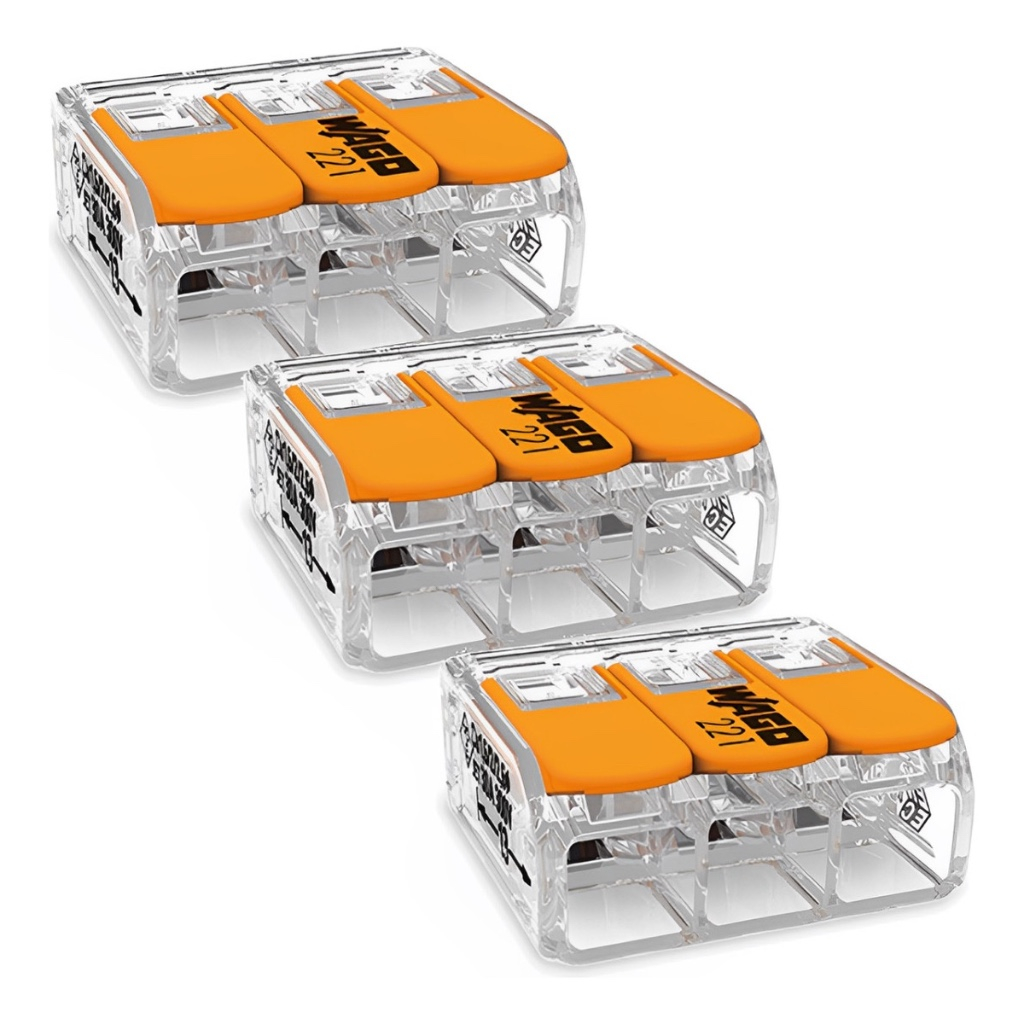 Kit 3 Conectores Emenda Para Fios Elétrico Chuveiro 3 Polos Flexível 0,5 – 6,0 mm² 41A Wago Isola Compacto 221-613