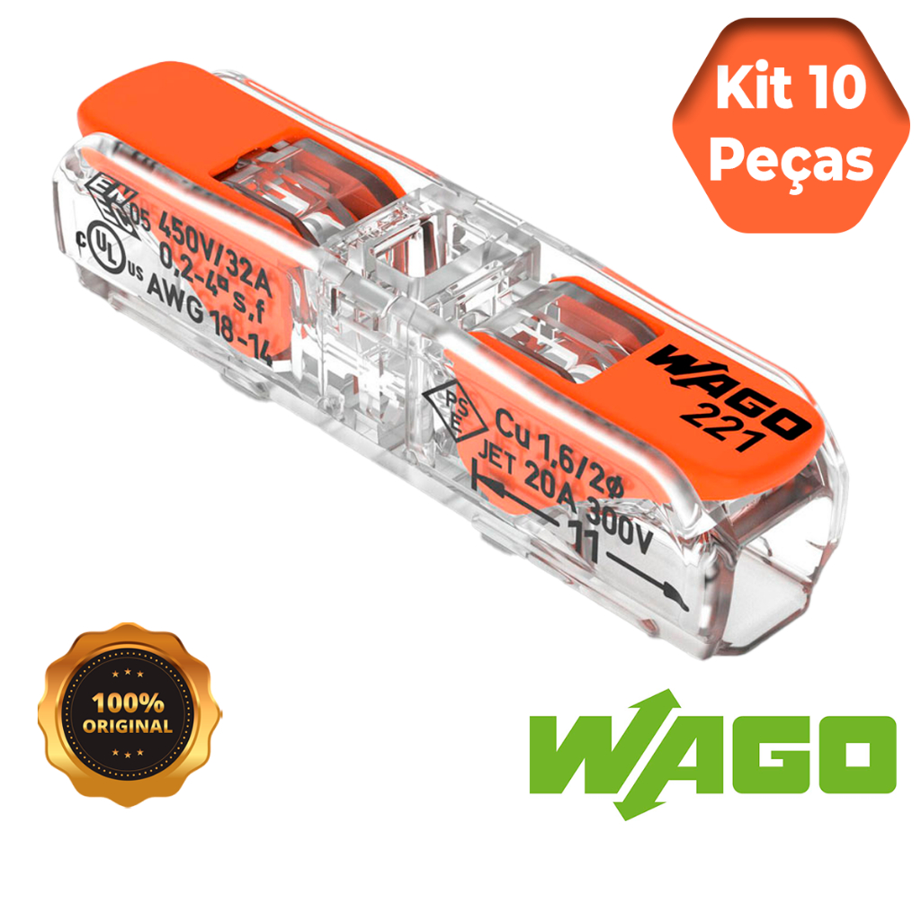 Kit 10 peças conector Wago original 221-412 emenda 2 polos 4mm 32A conexão automática
