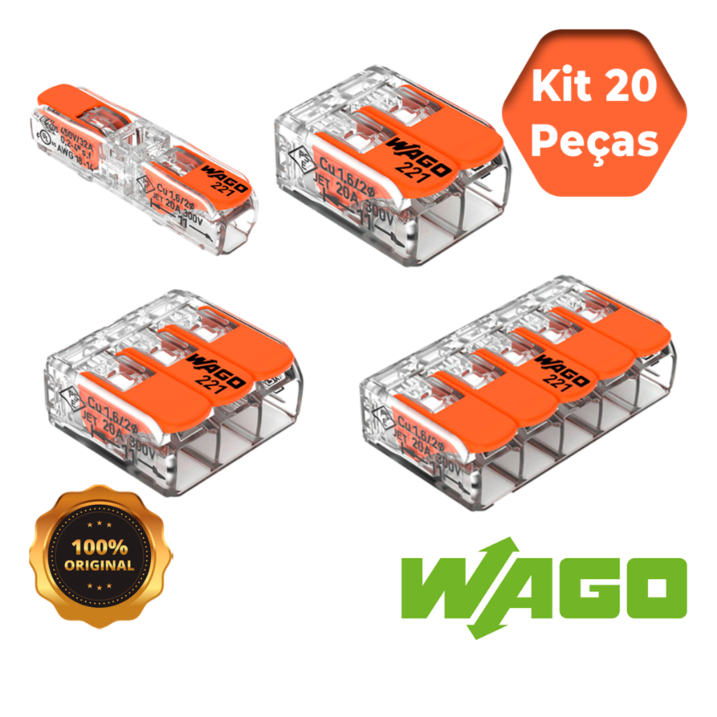 Kit 20 Peças Conectores Elétricos Emenda Wago Original 1, 2, 3 e 5 vias 4mm² e 6mm² 32 e 41A