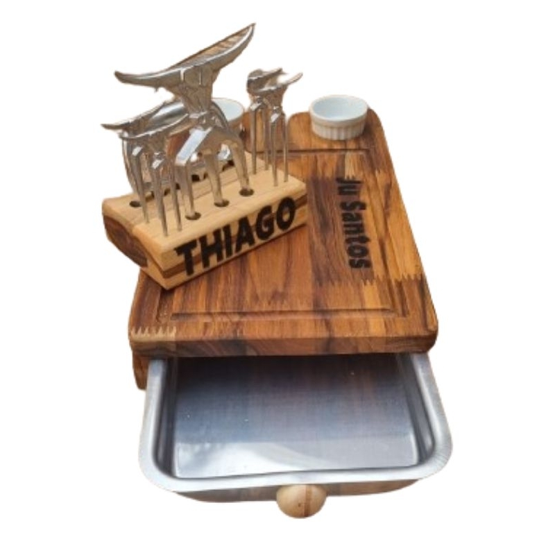 KIT TÁBUA DE CARNE COM BANDEJA + BASE CANTINHO CHURRASCO COM GARRA E TRIDENTE PERSONALIZADO