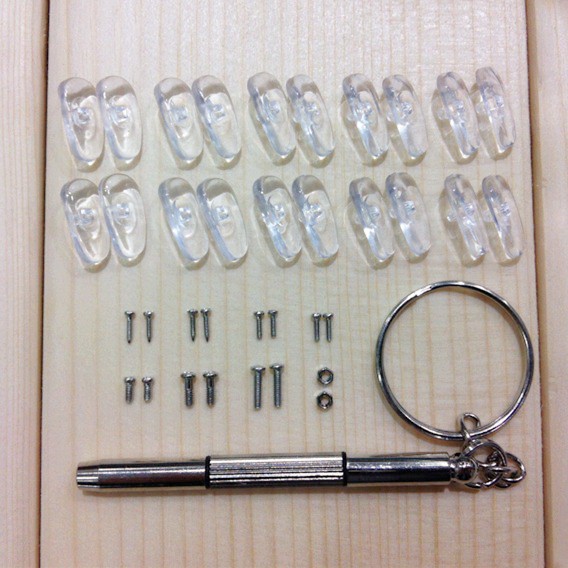 kit para conserto de óculos, faça você mesmo. Parafusos, chave e plaquetas