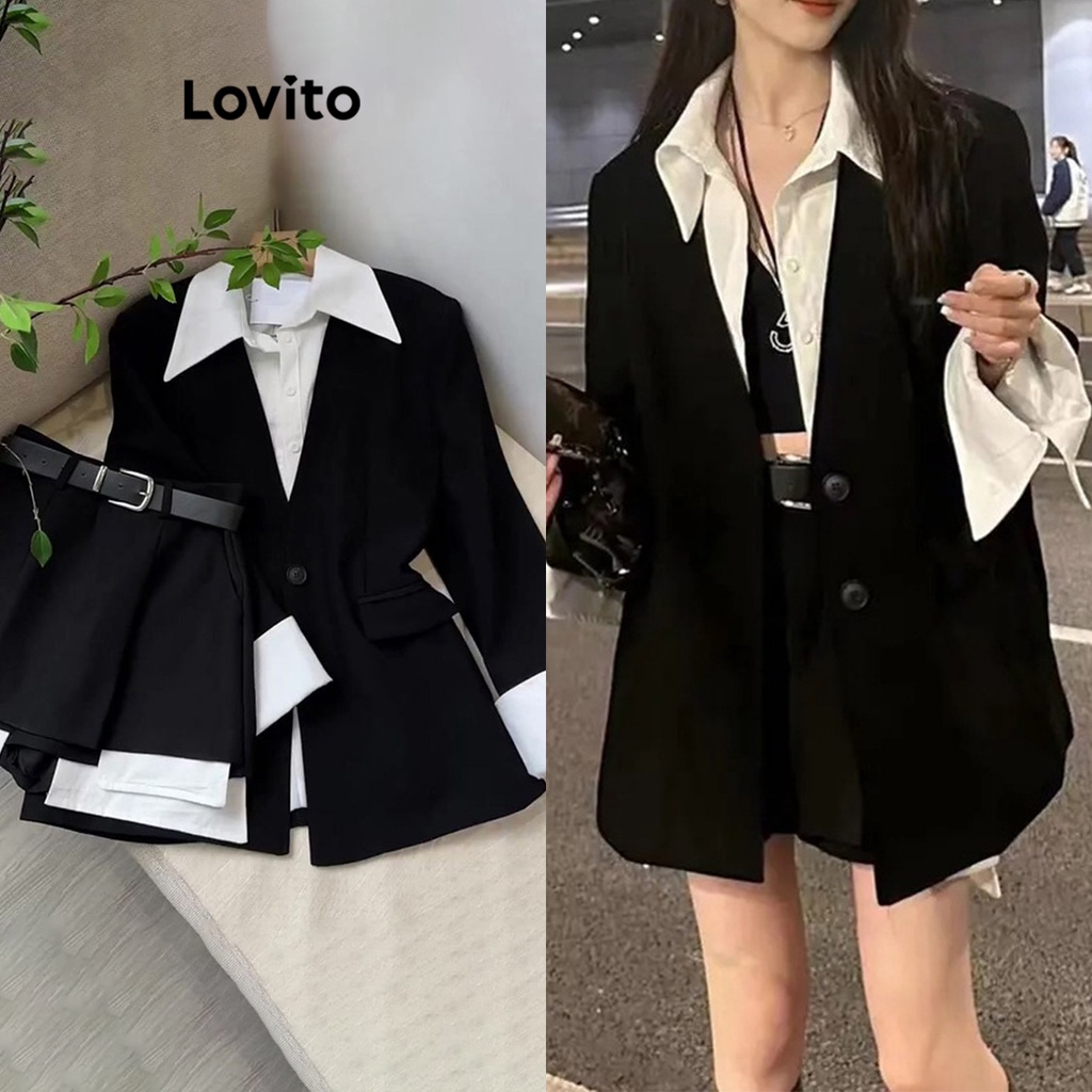 Lovito Blazer Frontal Com Botão De Bolso 2 Em 1 Falso Casual Patchwork Para Mulheres LNA35030 (Preto)