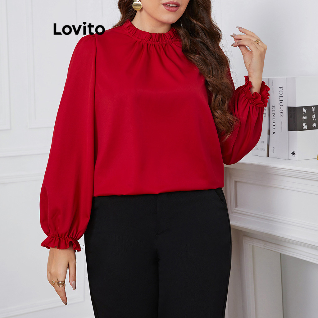 Lovito Blusa Plus Size Curve Elegante Lisa com Acabamento em Alface e Babados para Mulheres LNE85125