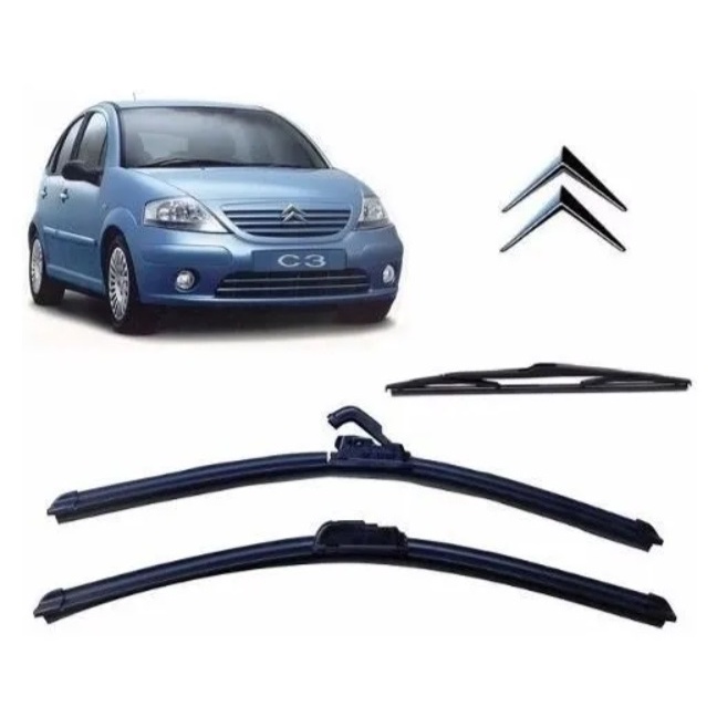 Kit 3 Palhetas Limpador Parabrisa Dianteiro + Traseiro Para Citroen C3 2002 2003 2004 2005 2006 2007 2008 2009 2010 2011 2012