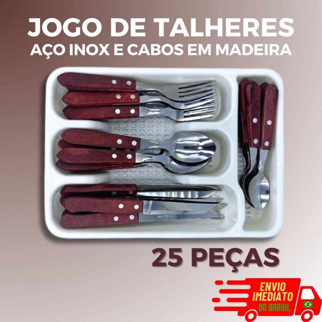 Faqueiro Jogo de Talheres Inox Cabo Madeira com Porta Talher / Bandeja Divisória - 25 Peças