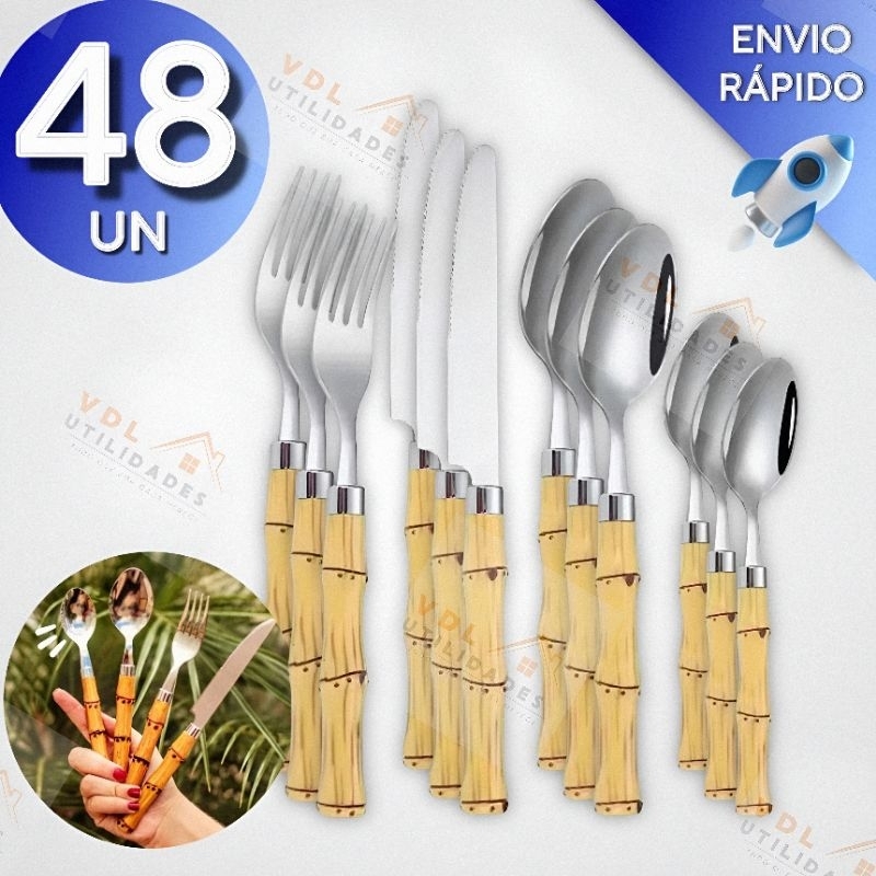 Jogo de Talheres 48 Peças Faca Garfo Colher e Colheres de Sobremesa Em Aço Inox de Cabo Plástico Bambu