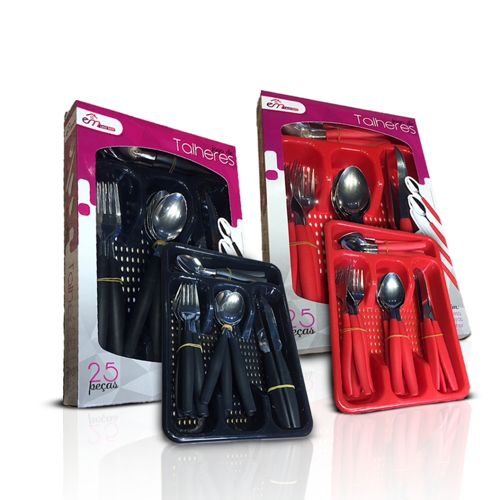 Jogo de Talheres 25 Peças Cabo de Plástico Aço Inox Conjunto Faqueiro com Porta Garfos Facas e Colheres Utensilio De Cozinha Multiuso