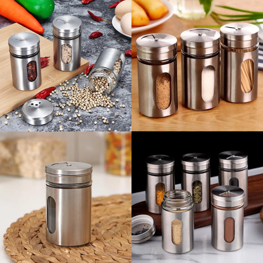 Saleiro Pimenteiro Porta Condimentos Kit com 2/4 ou 6 Peças Organizador Armazenamento Tempero em Inox com Visor