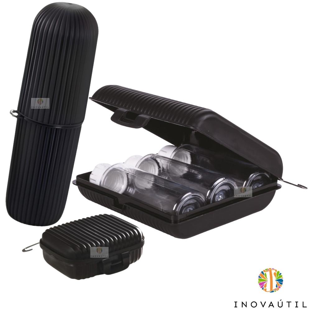 Kit Viagem Porta Escova e Creme Dental + Saboneteira com Tampa + Box com 3 Frascos 100ml Porta Shampoo, Condicionador, Sabonete líquido, Hidratante e Álcool em Gel