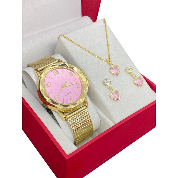 Kit Relógio Feminino Dourado + Colar Brincos e Caixa