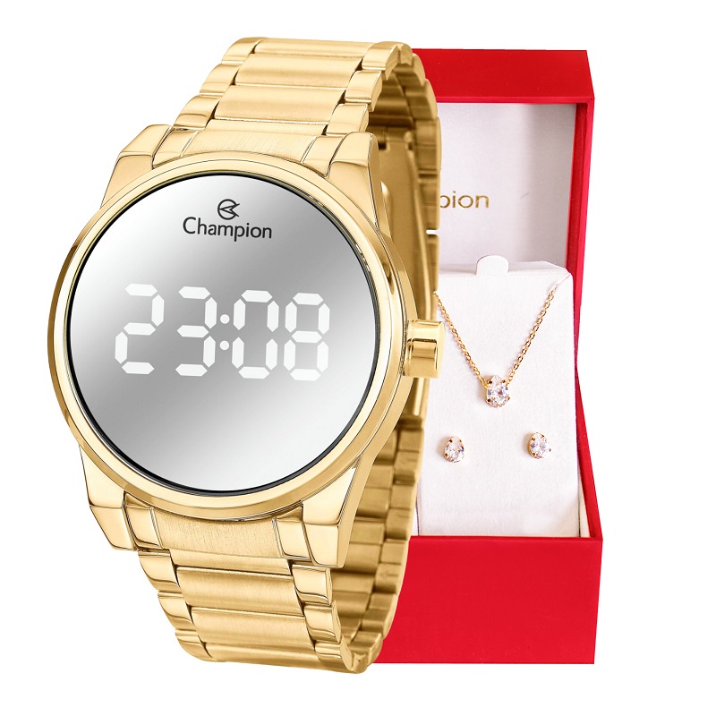 Relógio Champion Feminino Digital Espelhado Dourado Kit Colar e Brincos Original À Prova d'Água Presente Moda Gift Aniversário Tendência Estilo Mulher Namorada Mãe CH40124B