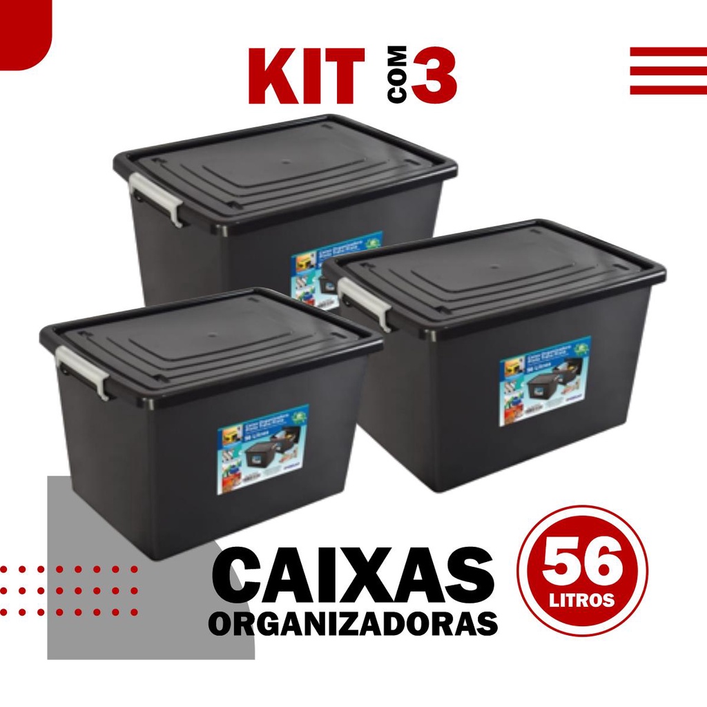 Kit 3 CaixasOrganizadora 56 Litros C/ Tampa e Trava Cesta Multiuso Tamanho Grande para guardar Brinq