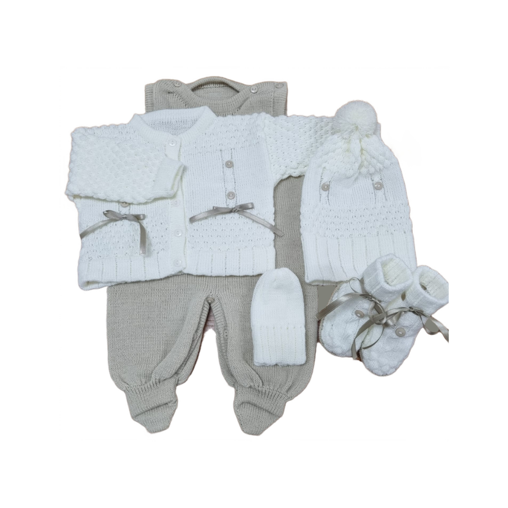 Kit Saída Maternidade Menino em Tricô Artesanal - Off White/Bege - 5 peças com sapatinho