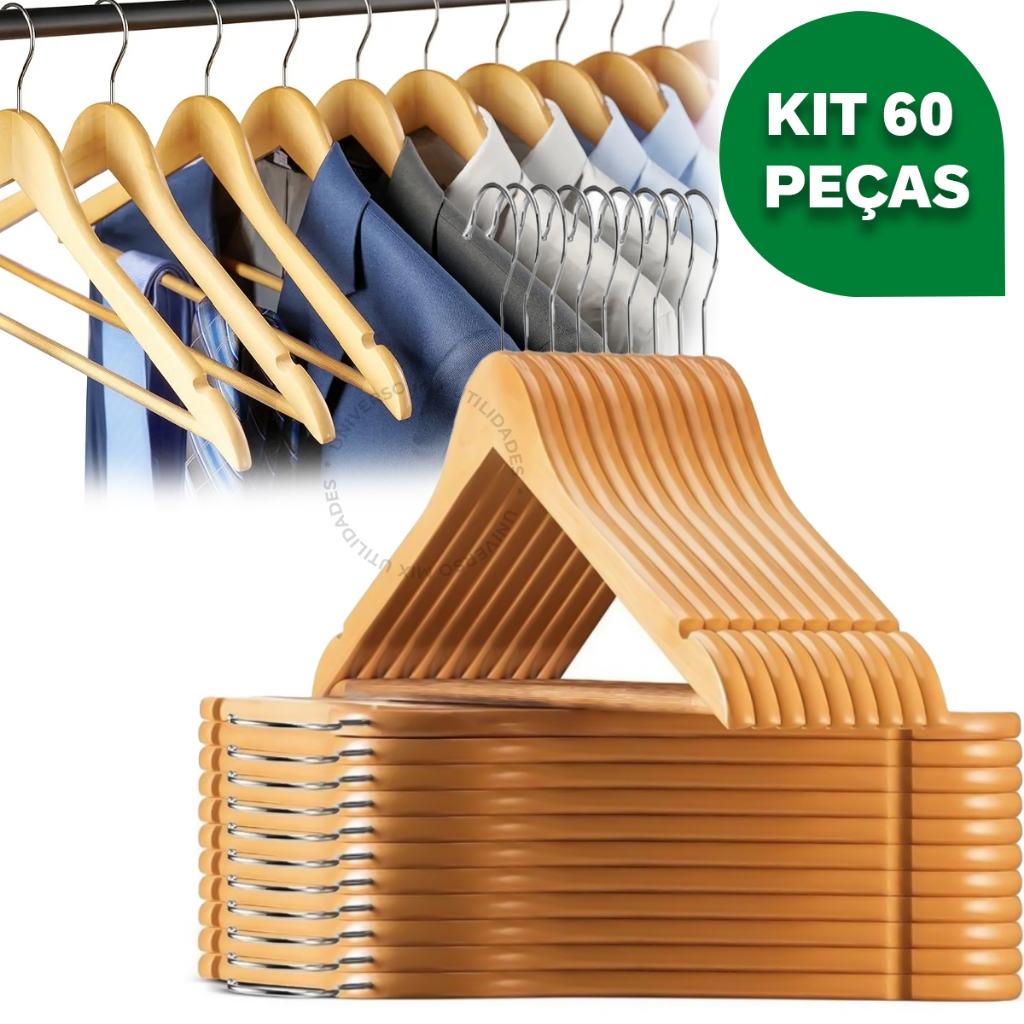 Kit 60 Cabides De Madeira Premium Marfim Para Roupas Calça Gancho Cromado
