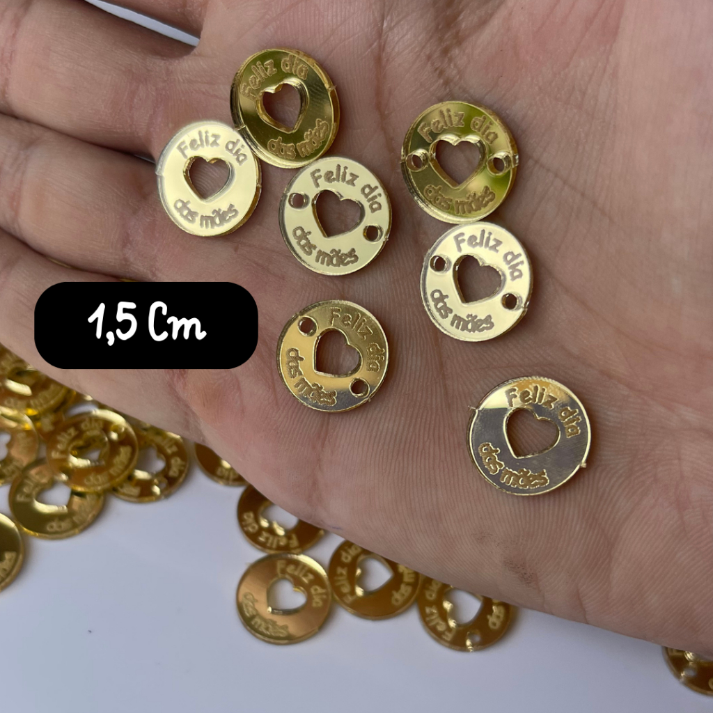 Kit 55 Aplique TAG Feliz Dia Das mães Acrilico Dourado - Mãe kit 1,5cm DISCO CORAÇÃO VAZADO