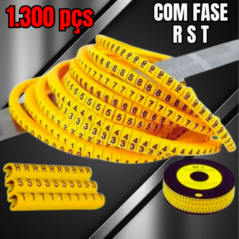 Marcador de Cabos e Fios Anilhas CFTV Numero 0 a 9 Kit 1.300 Peças fASE R S T