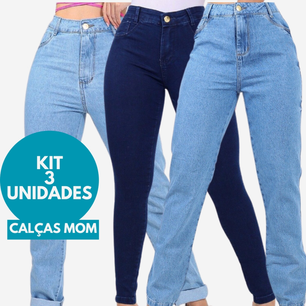 KIT 3 Calças Jeans MOM Cintura Alta Levanta Bumbum 100% Algodão Cós Alto Sem Lycra