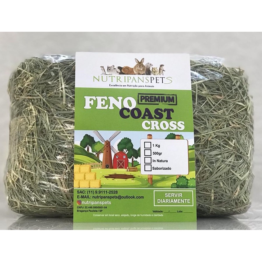 Feno Coast Cross Premium Verdinho Fresquinho Cheirosinho 500g ou 1kg NUTRIPANSPETS para Coelho, Porquinho da índia, Gerbil, Hamster, Chinchila e Roedores em Geral.