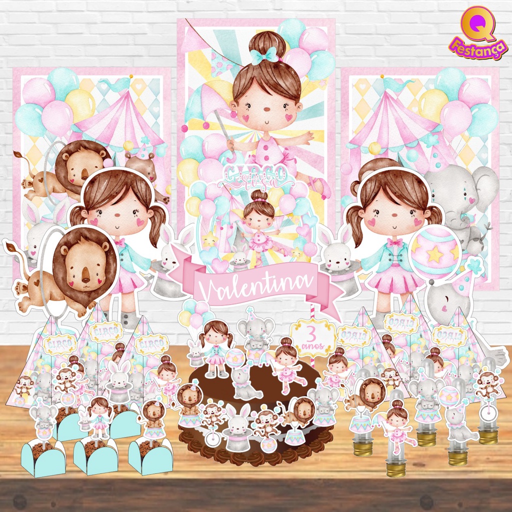 Circo Rosa Aquarela Kit Decoração Festa Pronta Só um bolinho *78 itens* Topo de Bolo Personalizado