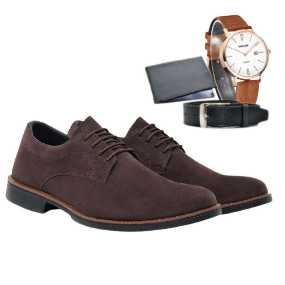 Kit Sapato Couro Legitimo Social Masculino Casual Sport + Relógio Analógico Cinto e Carteira