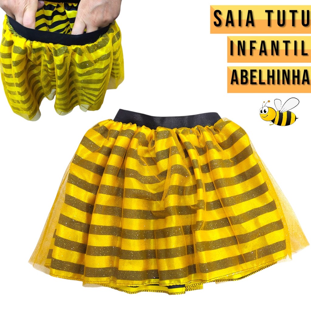 Saia Tutu Abelinha em Camadas Cetim e Tule Estilo Abelha Infantil Para Meninas