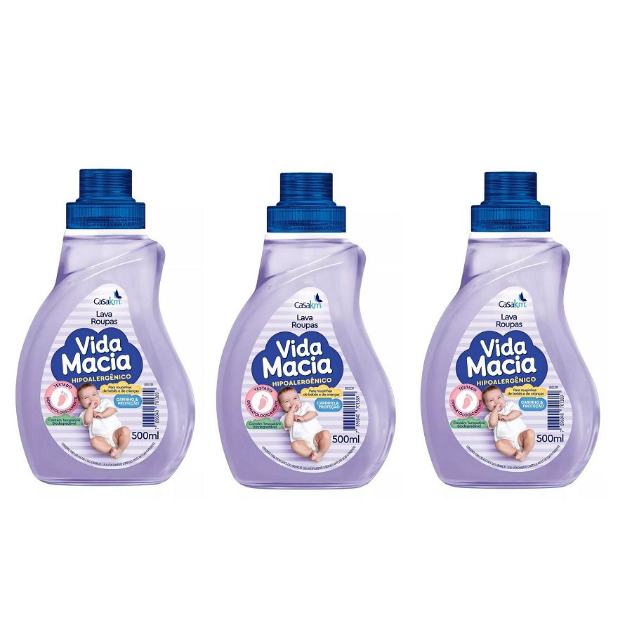 Kit 3 Lava-Roupas Líquido Carinho e Proteção frasco 500ml Cada - Vida Macia