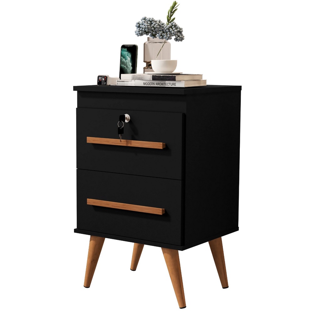 Mesa De Cabeceira Com Fechadura Preto Fosco 2 Gavetas Com Chave na Primeira