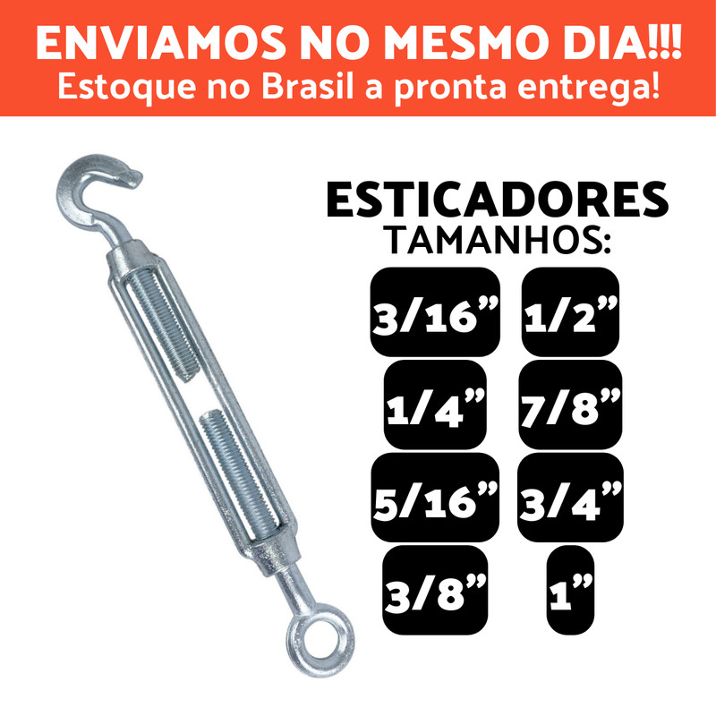 Kit 10 x Esticadores Para Cabos de Aço Gancho e Olhal 3/16" 1/4" 5/16" 3/8"
