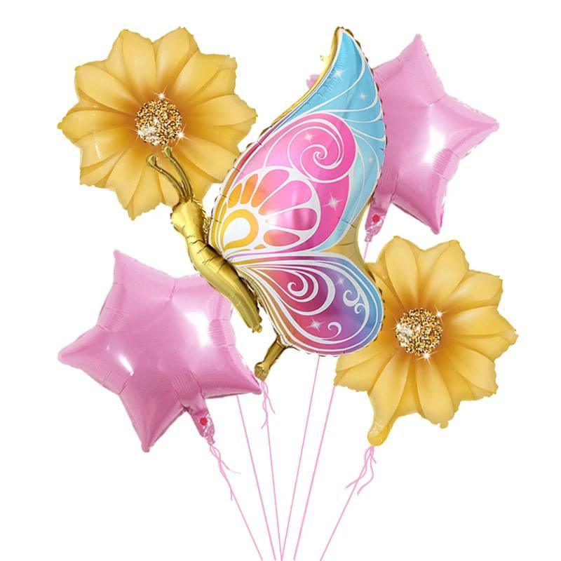 Kit c/ 5 Balão Metalizado Borboleta Dourado + Flor Girassol Amarelo + Estrela Rosa - Festa Jardim Encantado Decoração Enfeites