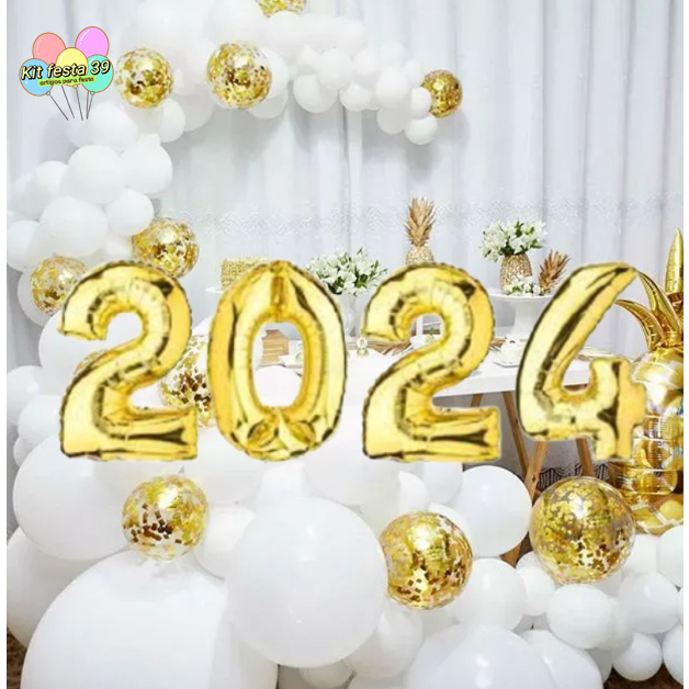Kit 64 Balão Bexiga Ano Novo Número 2024 Ouro + Branco N6.5 + Cristal N9 Com Confete Dourado Decoração