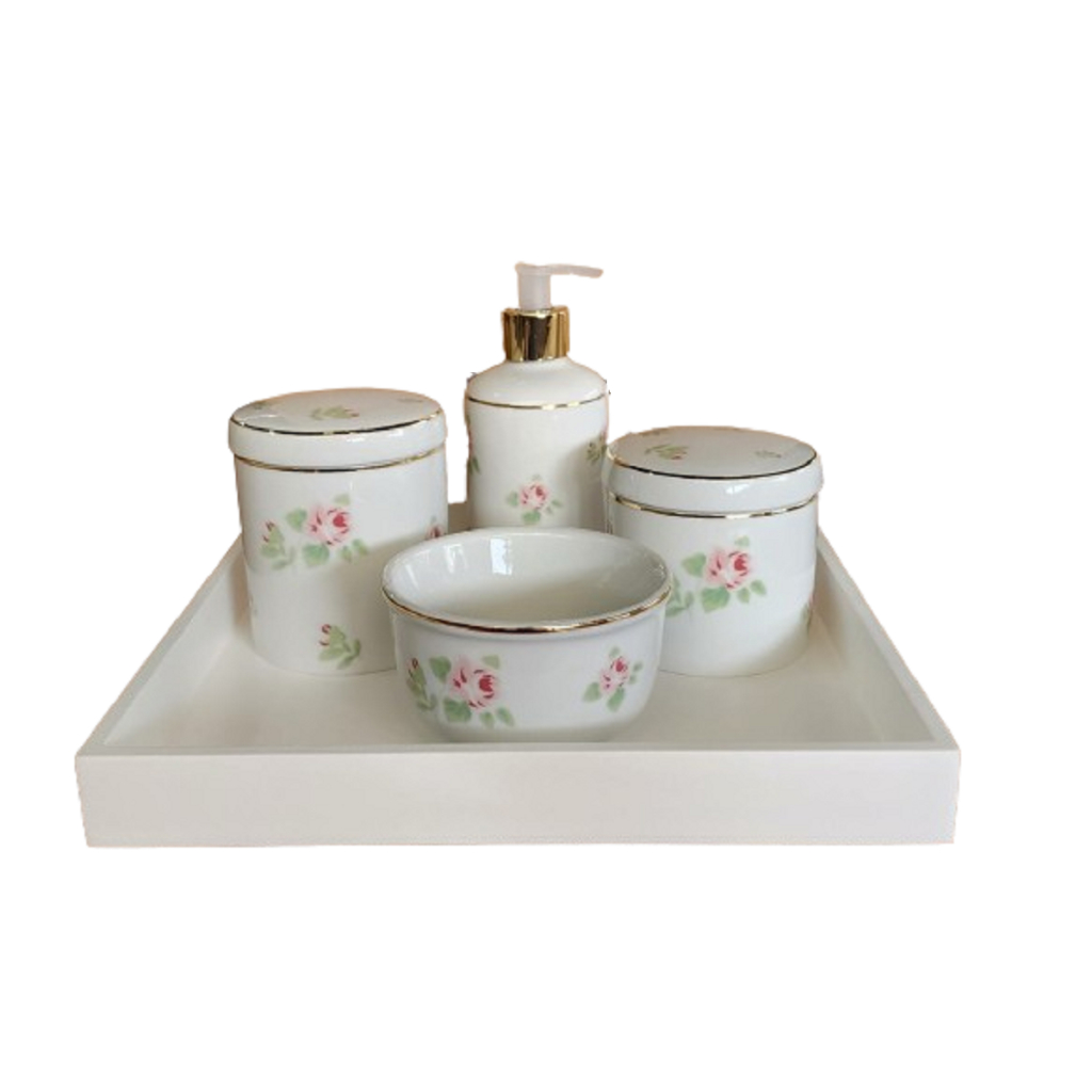 Kit Bebê Menina Flores Rosa Filete Ouro Com Bandeja Quadrada Mdf