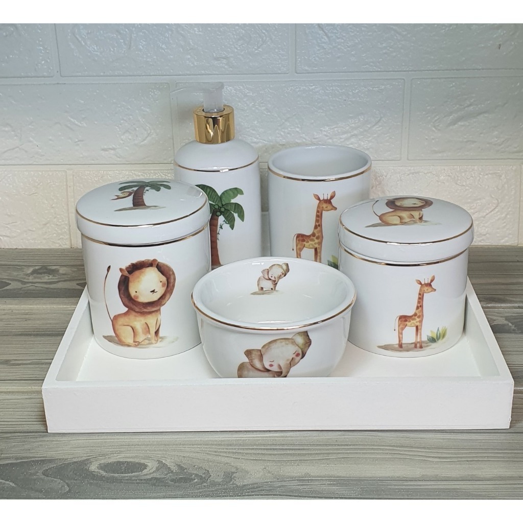 Kit Higiene Bebe Safari 5 Peças Porcelana Com Filete Ouro